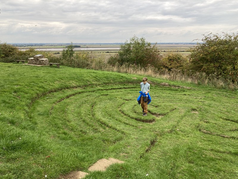 We weren’t quite done. From there we pushed on to the tower hide on stilts. With water levels down there wasn’t much to see, but the elevated view gave a new angle on the reserve. A concessionary path lifted us further onto the ridge, opening the whole landscape, the creeks, reedbeds and estuary, like a map at our feet. From there we dropped into the village for a different kind of history. St John the Baptist church stood closed, but just beyond it we found Julian’s Bower: a rare medieval turf maze cut into the ground. Thirteen metres across, its single winding path leads in and out in hypnotic turns. No one knows exactly when it was first cut, but standing at its centre with the estuary spread below, you feel both history and geography folding together, the maze at your feet, the floodplain at your back, and the Humber spilling towards the North Sea.