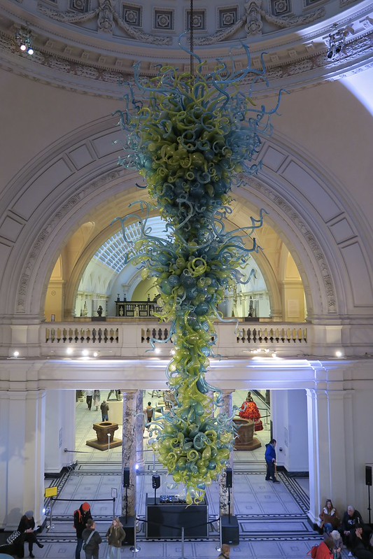 I had been keen to return to the Victoria and Albert Museum for a while, as I don’t think I had been since my visit while studying GCSE Art. We arrived beneath a cascade of colour and glass, Dale Chihuly’s V&A Chandelier, its curling blue and green forms suspended in the grand entrance like an underwater explosion. It was the perfect welcome: light, movement, and craftsmanship intertwined, setting the tone for a day that would balance history, creativity and a bit of play.