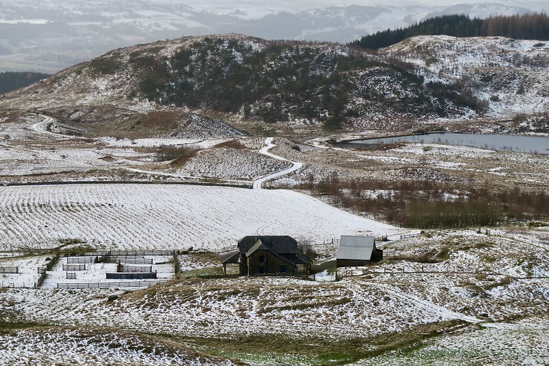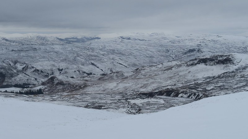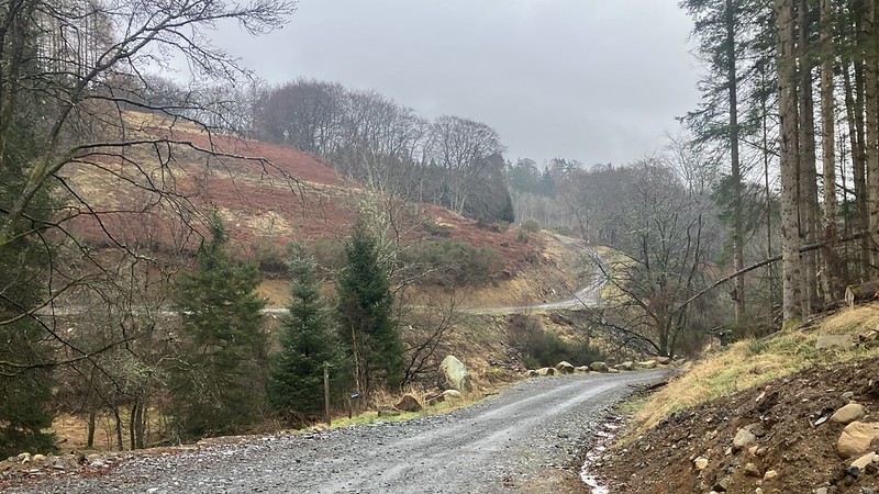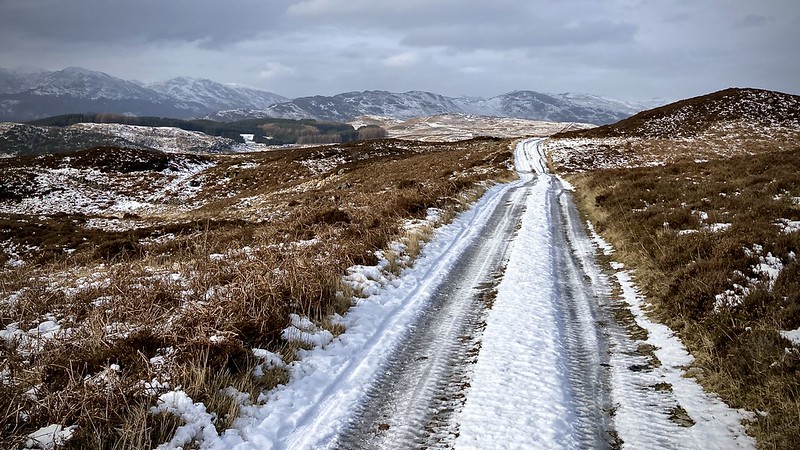 Forest tracks carried us gently upward between bike routes, snow beginning to gather in shaded hollows and after a little bit of luck we found our way on to commercial forestry tracks and after a bit of retracing our steps we were on the hillside, once part of a classic Highland estate system: parkland near the house, woodland beyond and high moor kept open for grazing and sport.