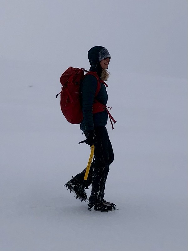 With packs on we set off along the track with its patches of snow and ice and past a dam. Before committing to the slopes we had a quick conversation about ice-axe use. The snow wasn’t ideal for arrest practice: a hard frozen base, thin wind-slab in places and a thick crust above. With the weather window potentially tightening, we sensibly decided to keep moving. By around 500 metres the snow improved beautifully firm and supportive and progress up toward the ridge felt steady and secure.